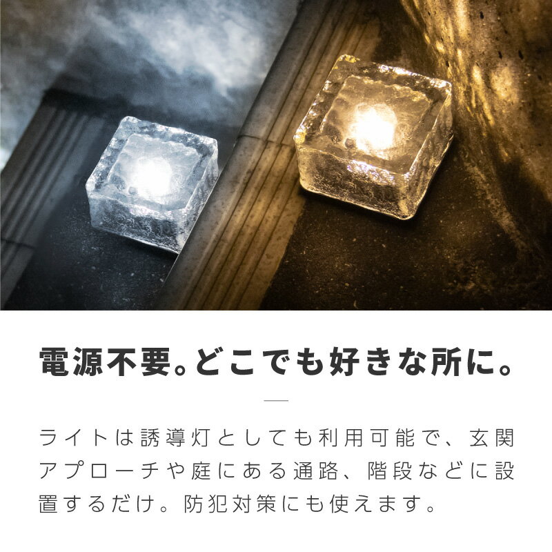 商品内容■ 入数 : 2個セット■カラー:3色展開・電球色・ホワイト・ウォームホワイト商品詳細■ サイズ : 幅7cm×7cm×高さ5cm ■ 重量 : 280g ■ バッテリー容量 : 600mAh ■ ソーラー出力 : 2v、100mA ■ 充電時間 6-8時間 ■ 点灯時間 6-8時間 ■ 防水防塵等級 : IP65 ■ 点灯モード : 自動点灯モード ■ 明るさ : 22ルーメン注意事項■お届け後は速やかに開封し、破損や商品不具合が無いことを確認してください。